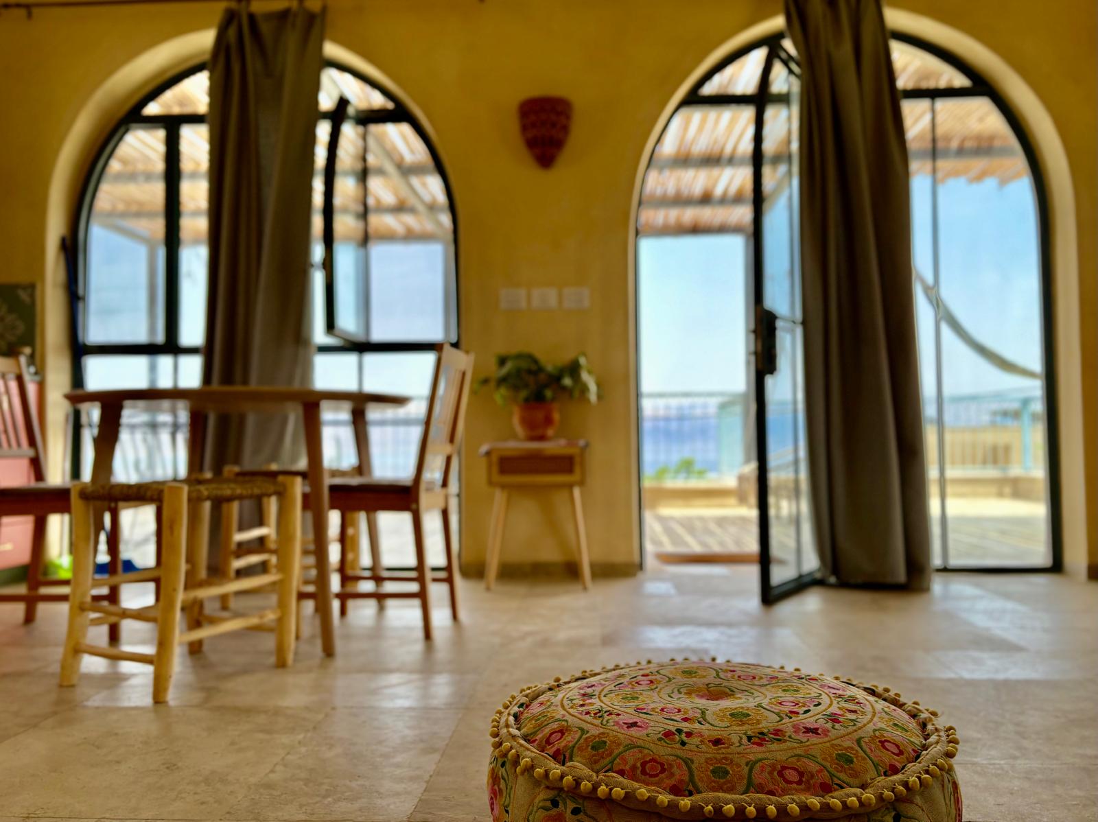 בקומה השניה עם חלונות קשתיים, מרפסת ערסלים ונוף מדהים.